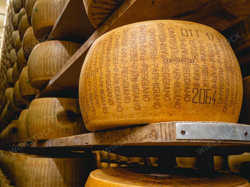 A certified Parmigiano Reggiano cheese wheel maturing in a dairy farm manufacturing storage