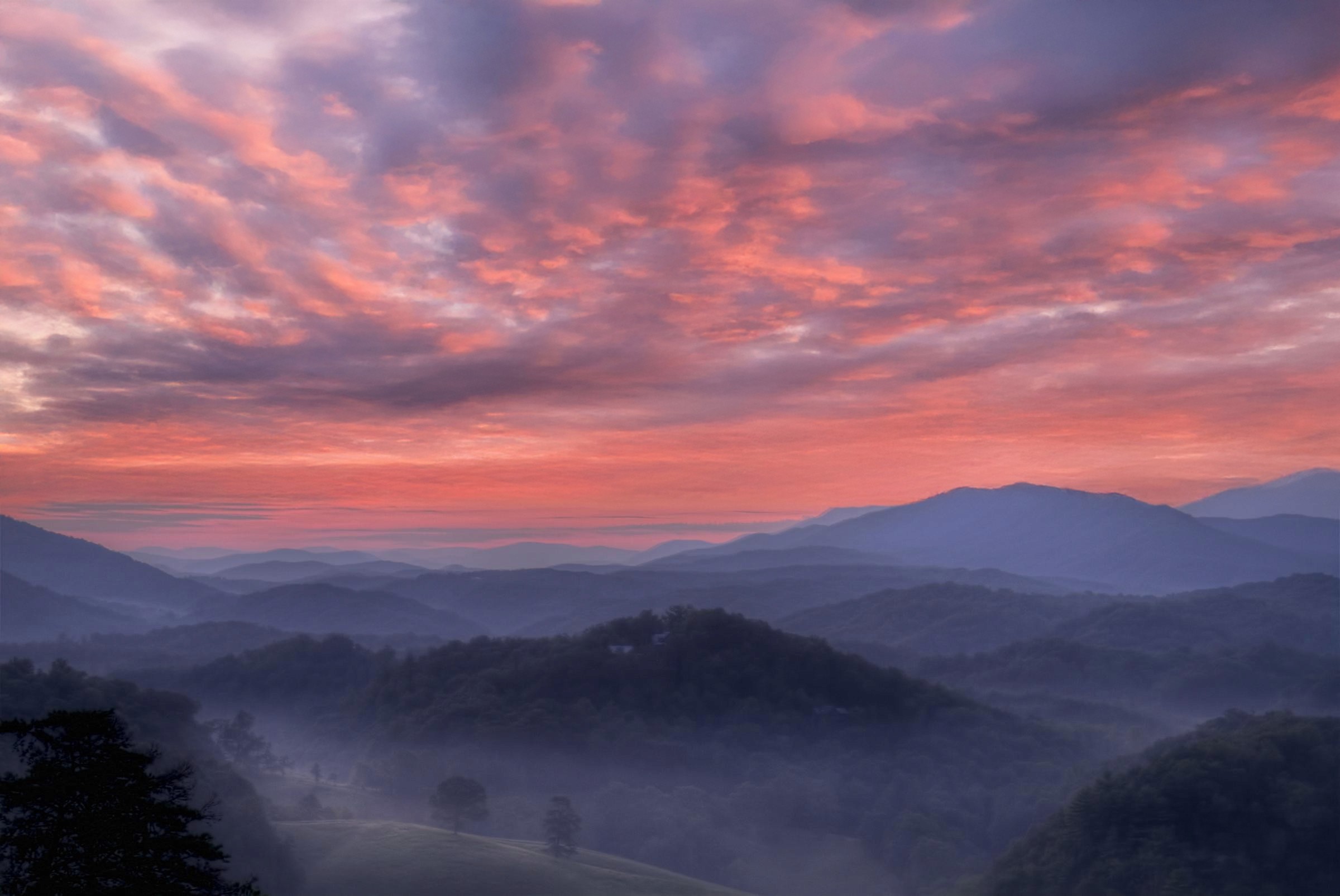 A breathtaking sunrise is visible over a mountainous landscape covered with slight fog.