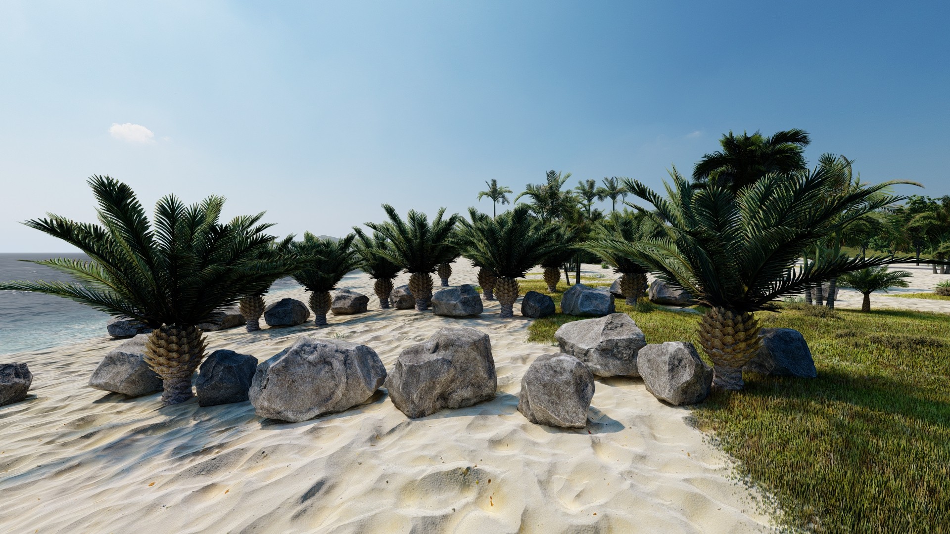 Add a group of large rocks to the beach. Add big pineapples with big leaves around the trees.