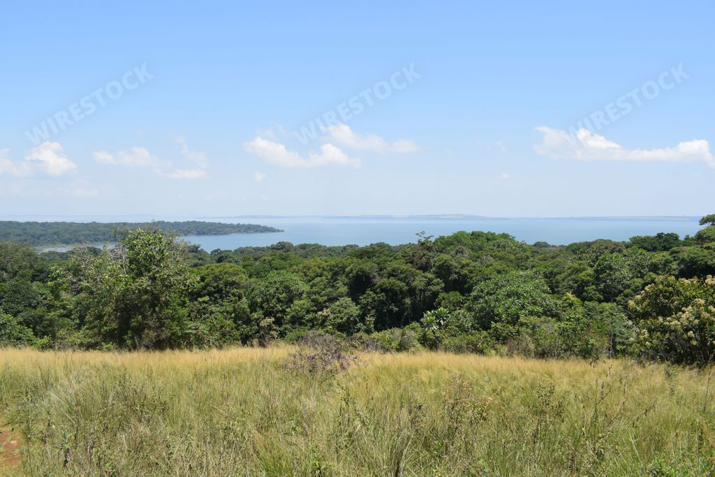 Description: The Kalangala island landscape in Uganda with blue sky background grass trees around