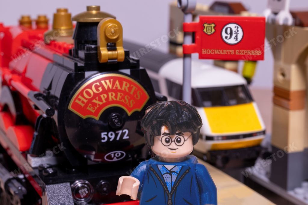 David Bond | a harry potter lego figure stands next to a train with hogwarts steam