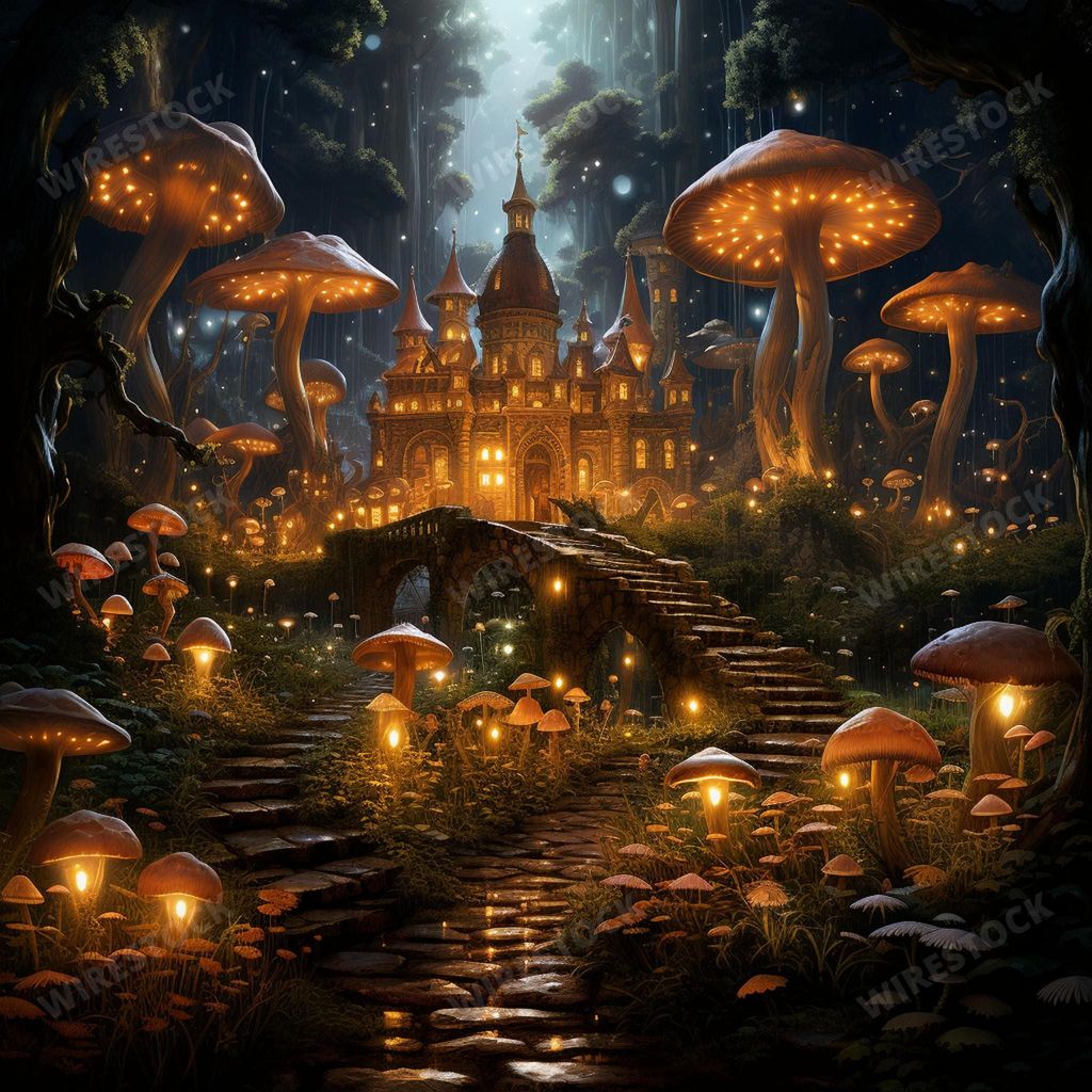 Media type: IllustrationDescription: An AI generated illustration of a magical castle surrounded by glowing mushrooms and sparkling lights