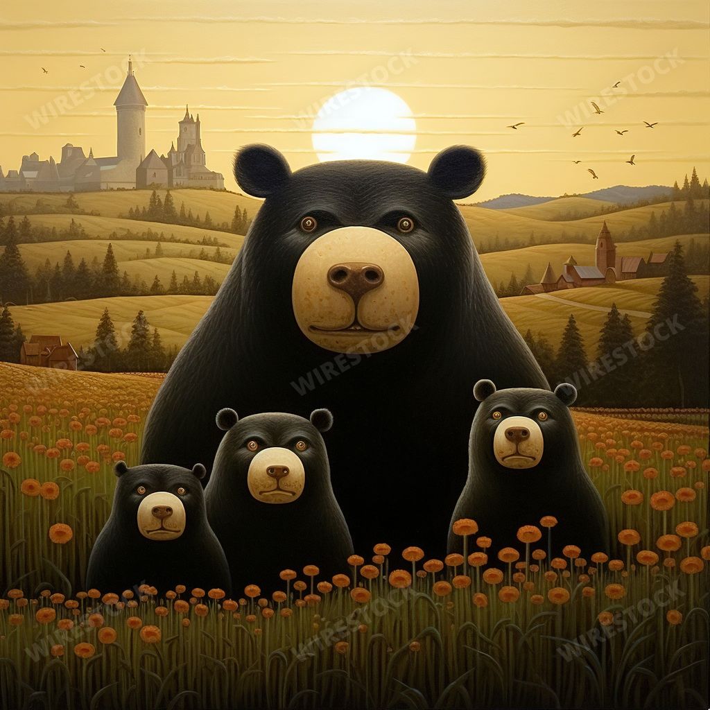 Media DetailsAI generated imageCaption:: "Enchanted Evening" is a captivating illustration that brings to life a family of four black bears, standing upright in a field of vibrant orange flowers. The bears, dressed in their finest attire, gaze at the viewer with an air of serene majesty. The backdrop features an enchanting castle and tower perched on a distant hill, bathed in the warm glow of a setting sun. Birds take flight in the orange sky, adding to the peaceful ambiance. This artwork is perfect for those who appreciate the blend oID: 21229390File size: 6144x6144 pixelsFormat: jpg