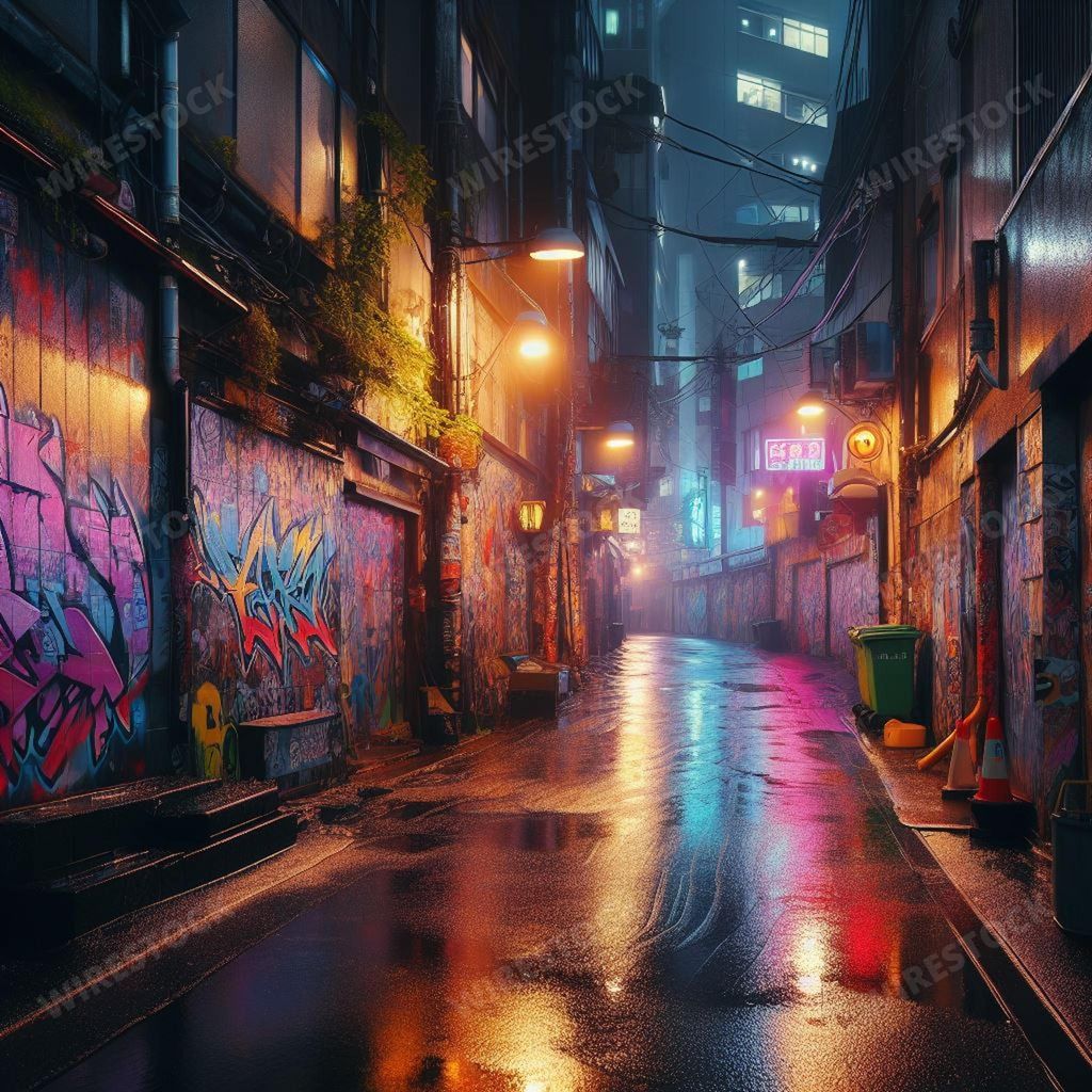 Media type: IllustrationDescription: An AI illustration of A nighttime street scene in the rain featuring illuminated alleyway lights and colorful graffiti art adorning a brick wall