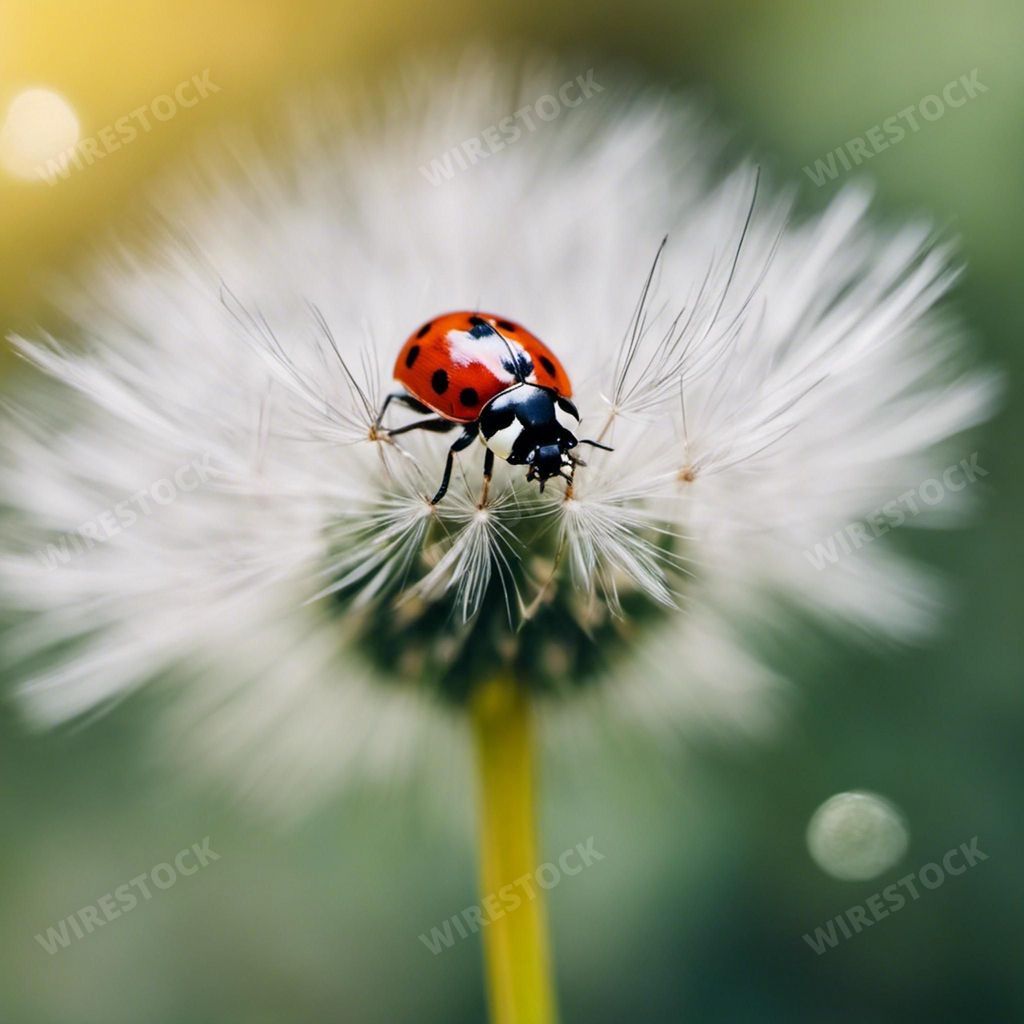 Media type: IllustrationDescription: An AI illustration of A macro shot of a ladybug perched on top of a dandelion flower stem in a vibrant green field
