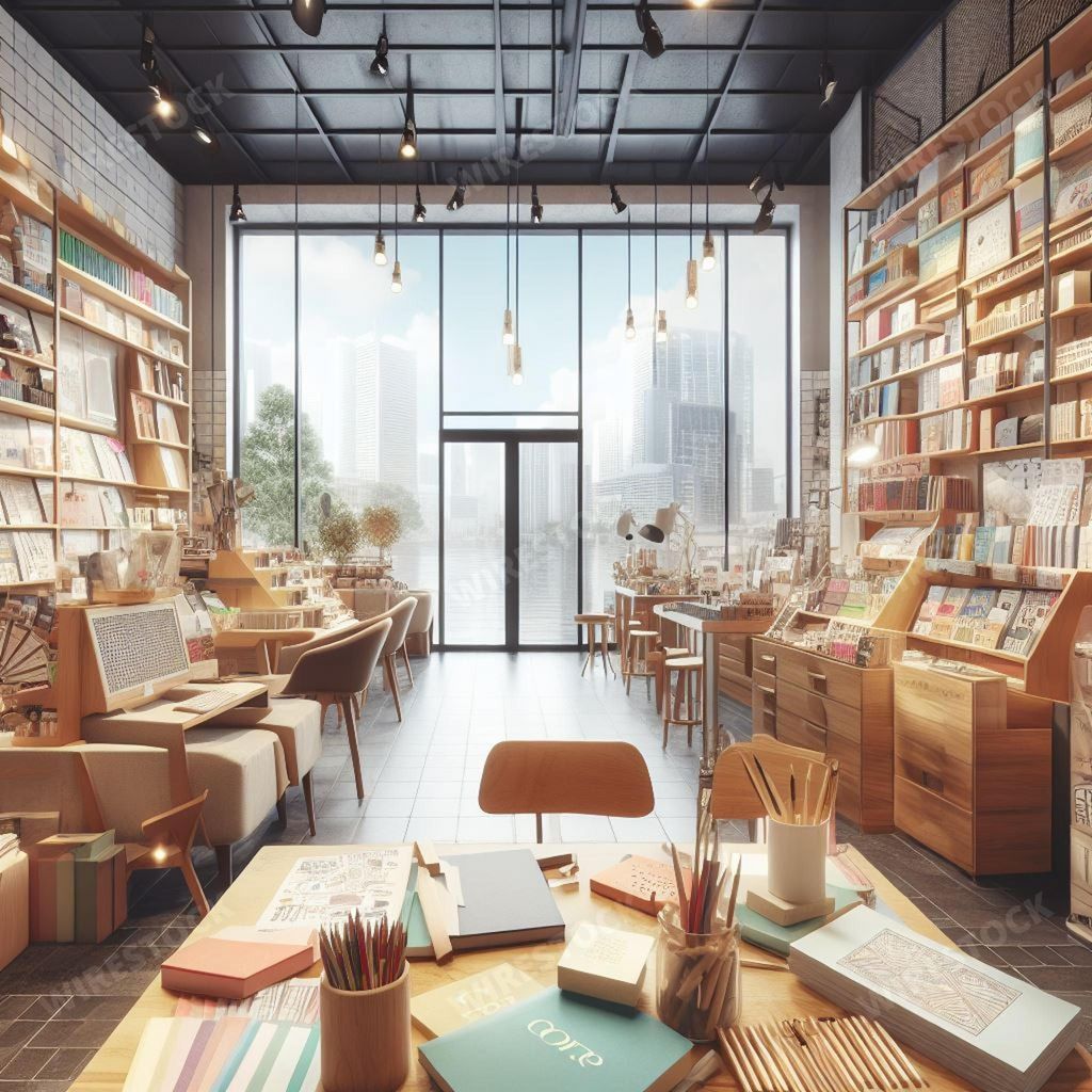 Media type: IllustrationDescription: An AI illustration of A modern office space with wooden shelving units and desks, featuring multiple laptops and books