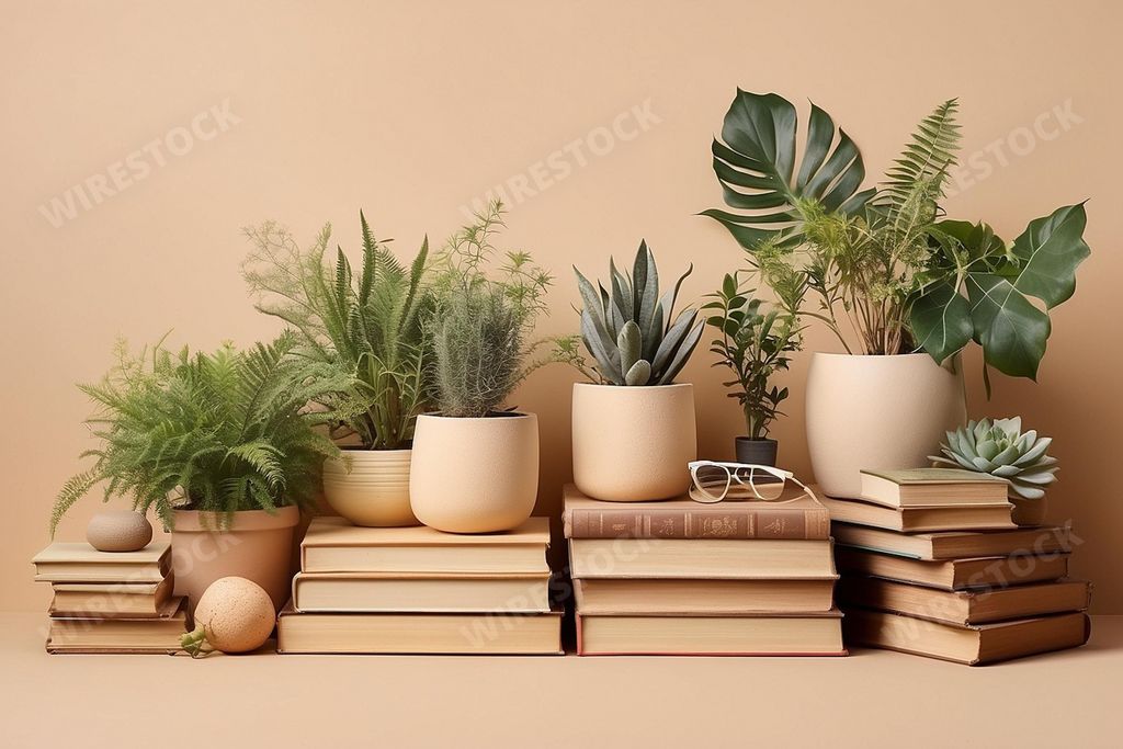 Media type: IllustrationDescription: An AI illustration of A selection of decorative books arranged atop a wooden table with two potted plants providing an attractive contrast of colors