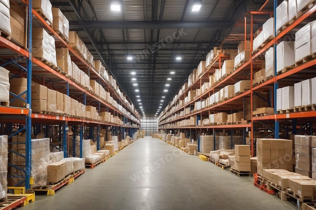 Media type: IllustrationDescription: An AI illustration of A wide-angle shot of a storage facility interior, featuring aisles of stacked boxes on shelves lining the walls