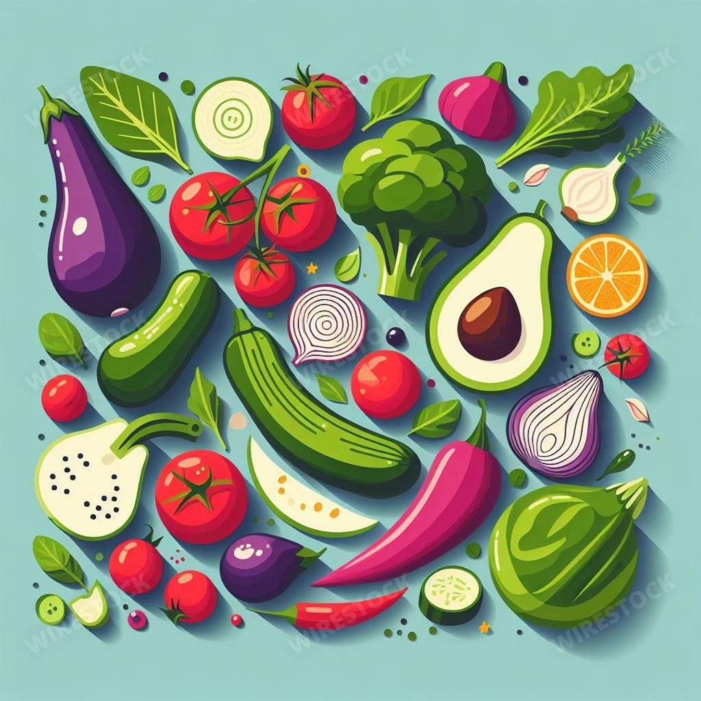 Media type: IllustrationDescription: An AI illustration of an assortment of fresh fruits and vegetables displayed together on a blue background