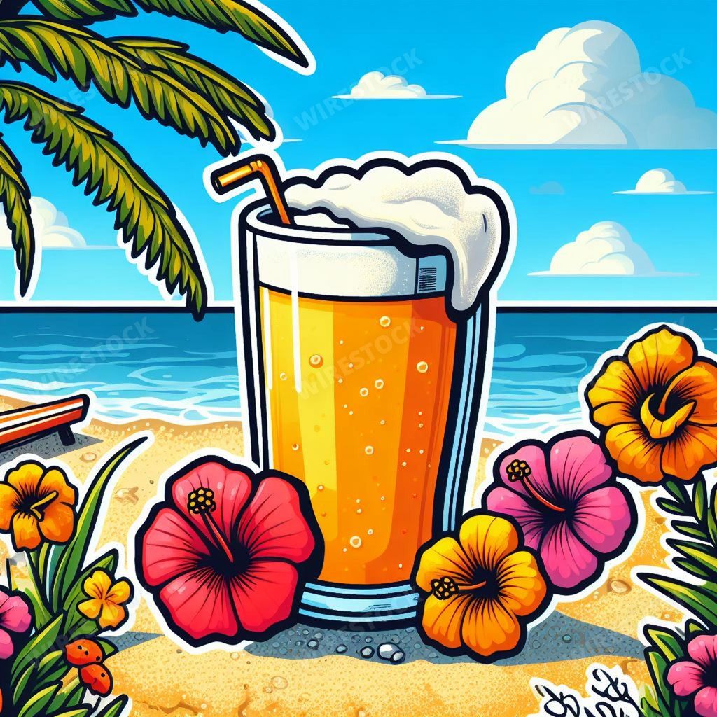 Media type: IllustrationDescription: An AI illustration of An AI generated illustration of A glass of refreshing beverage sitting atop a sandy beach, with a beautiful tropical flower and