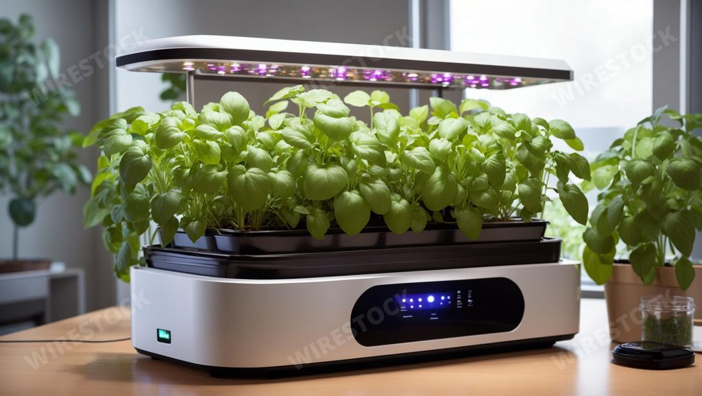 Media type: IllustrationDescription: An AI illustration of An AI generated illustration of A digital kitchen countertop featuring a built-in greenhouse for growing plants