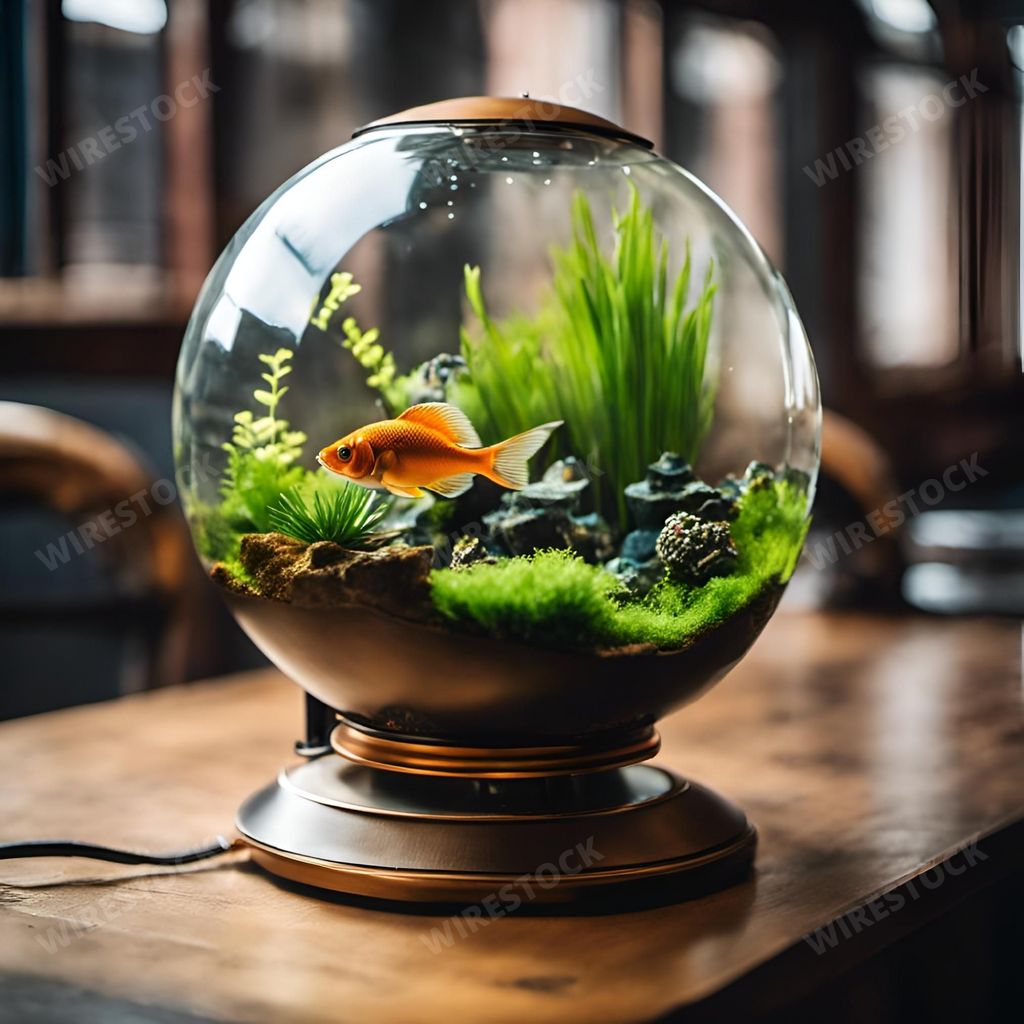 Media type: IllustrationDescription: An AI illustration of a vibrant orange fish swimming in a small, clear glass fishbowl.