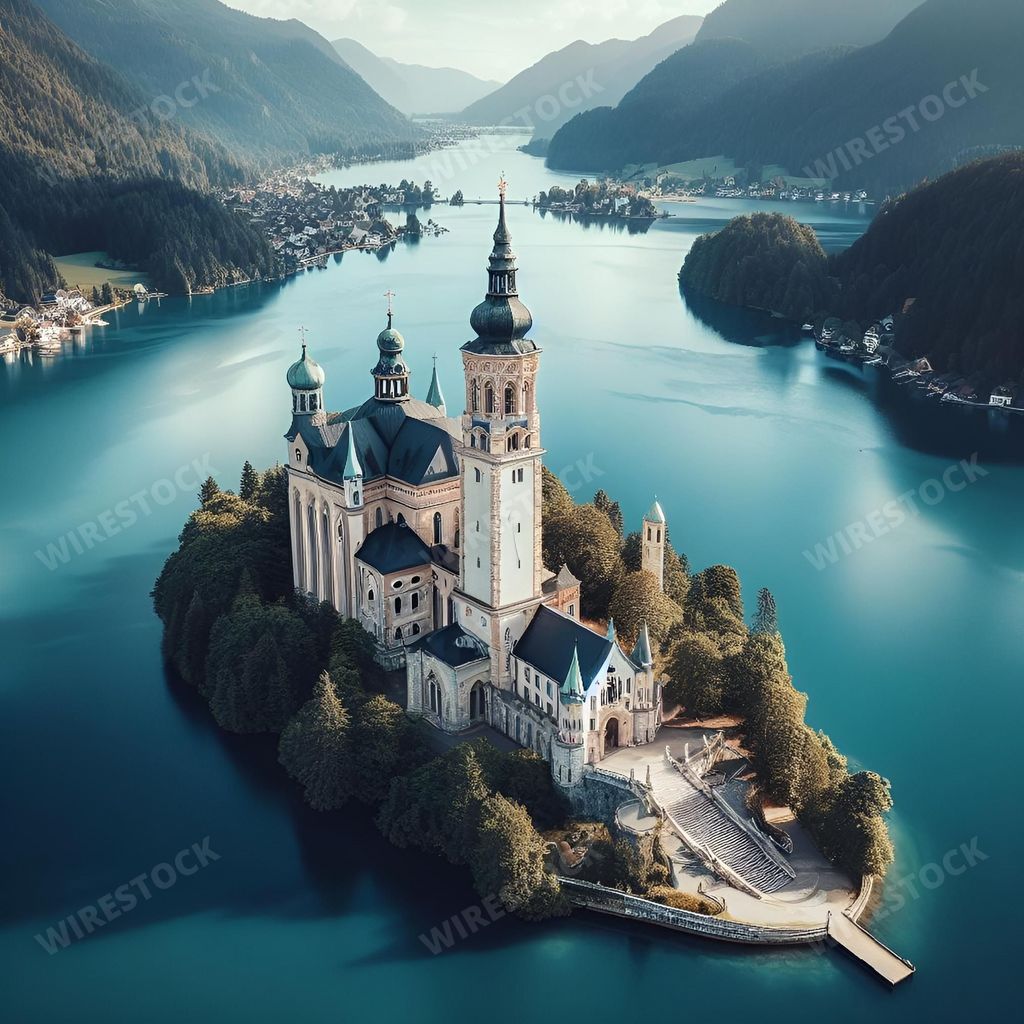 Media type: IllustrationDescription: An AI generated illustration of An idyllic landscape featuring a grand church on an island in the middle of a scenic lake