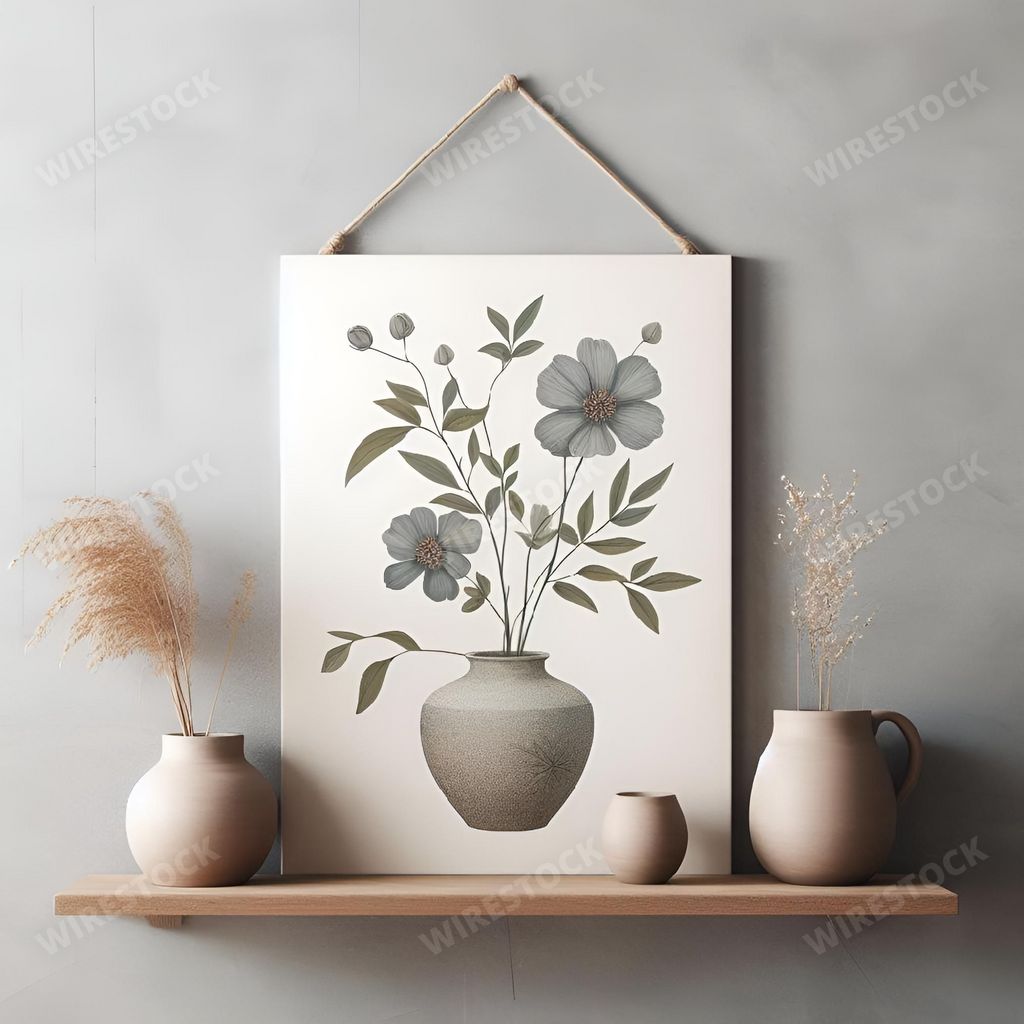 Media type: IllustrationDescription: An AI-generated illustration of A still life featuring a clay vase filled with fresh, vibrant flowers