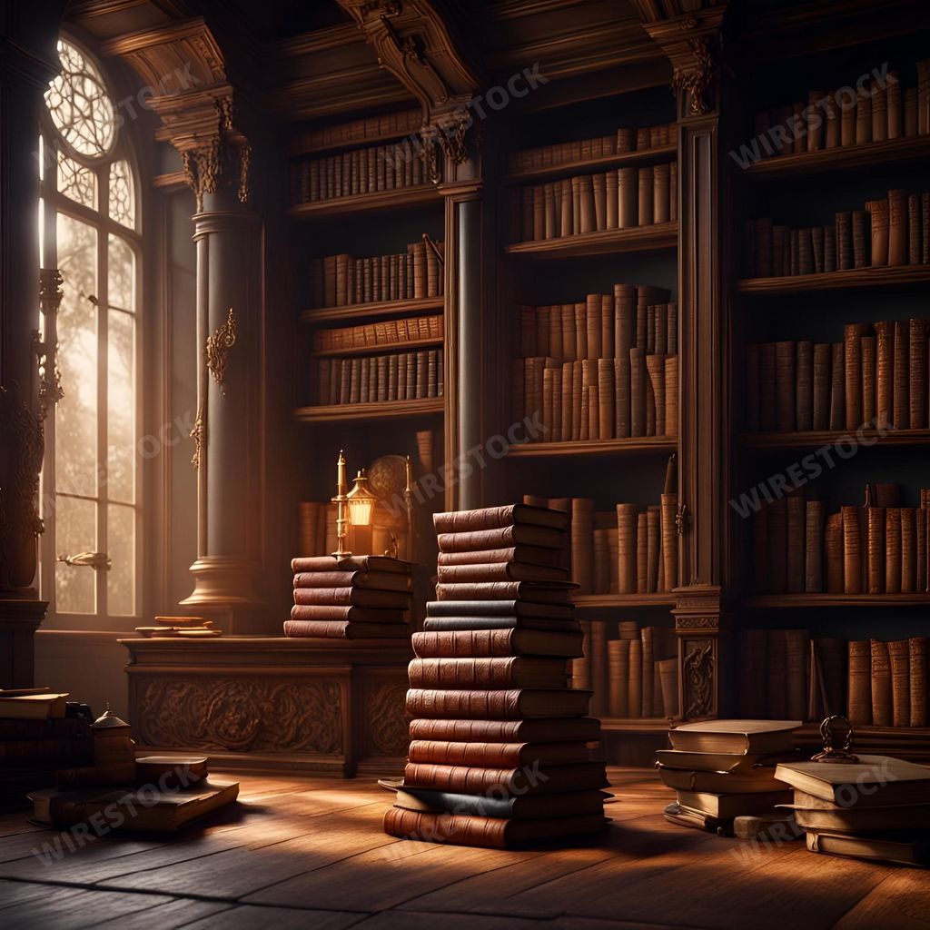 Media type: IllustrationDescription: An AI illustration of a room featuring a selection of books scattered in front of shelves.