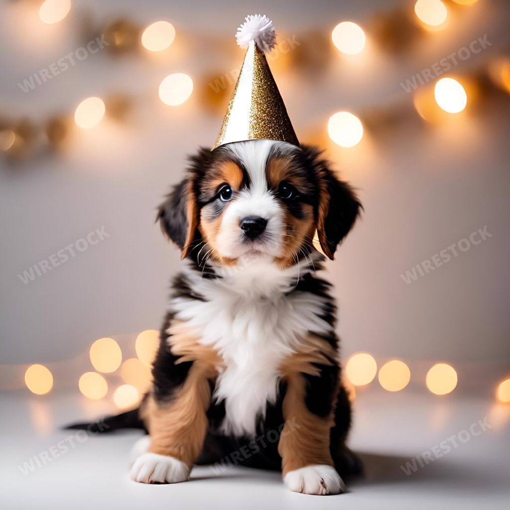Media type: IllustrationDescription: An AI-generated illustration of a puppy wearing a festive party hat while sitting on a white surface with cheerful string lights in the background