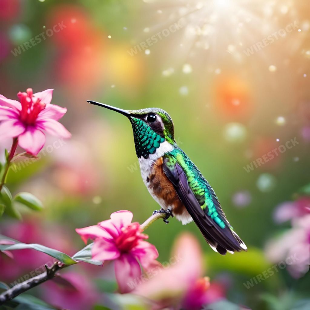 Media type: IllustrationDescription: An AI generated illustration of A beautiful hummingbird perched atop a vibrant array of colorful blooms in a lush garden setting