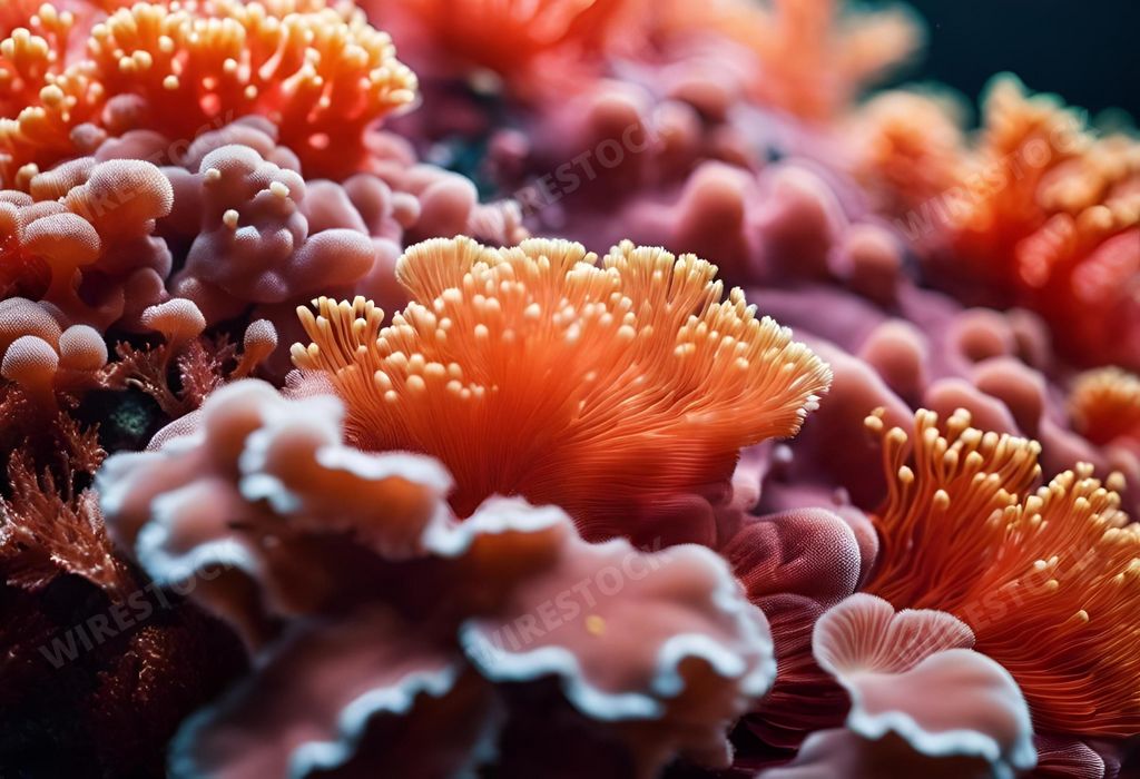 Media type: IllustrationDescription: An AI generated illustration of A vibrant close-up shot of a coral reef featuring a bright array of colors and white anthers