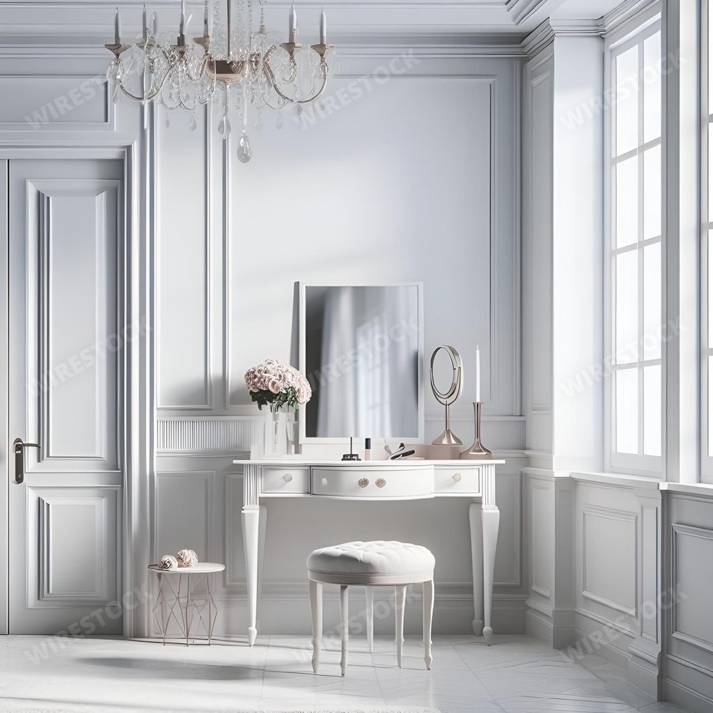 Media type: IllustrationDescription: An AI generated illustration of a contemporary room with a sparkling chandelier, a white make up table with a sleek sink, and stylish mirror