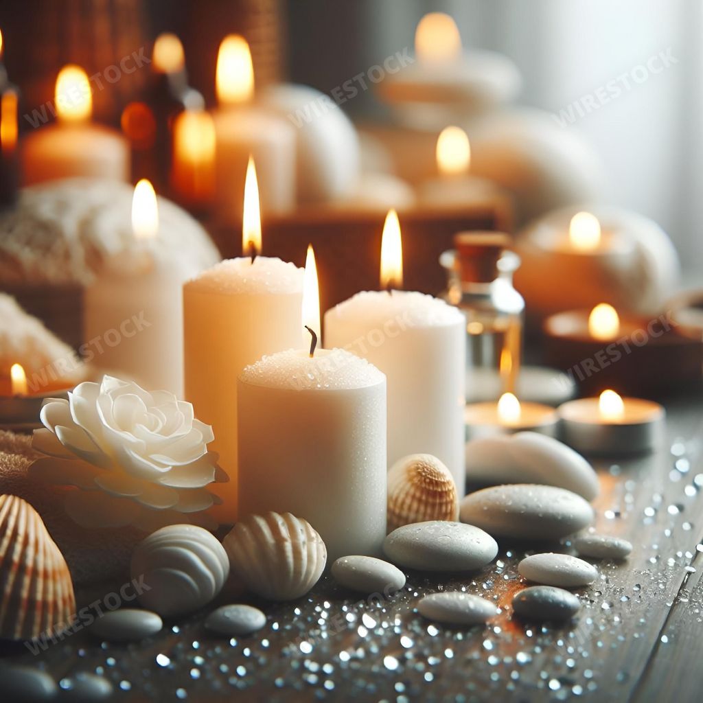 Media type: IllustrationDescription: An AI generated illustration of A beautifully decorated wooden table with a variety of elements including many candles, seashells, and flowers