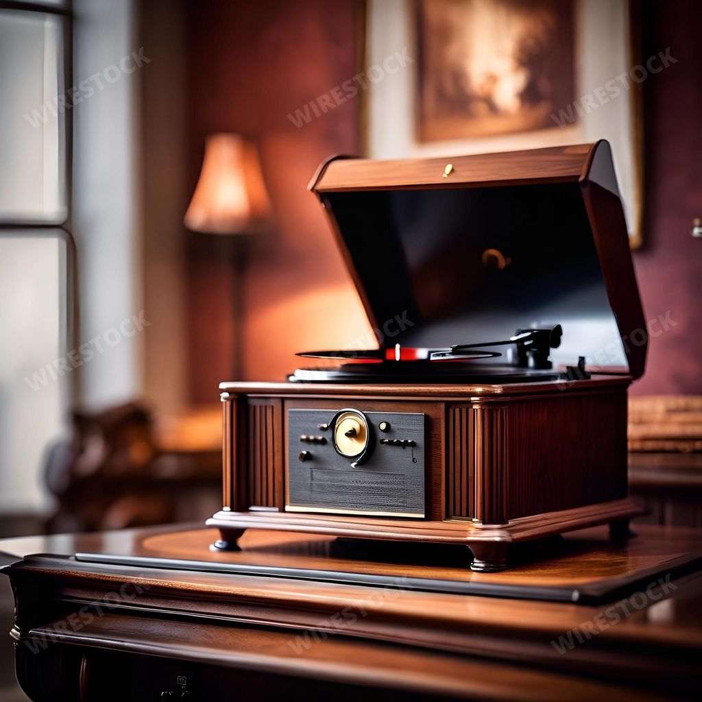 Media type: IllustrationDescription: An AI generated illustration of an antique wooden record player sitting on a table with a lamp, artwork, and painting in the background