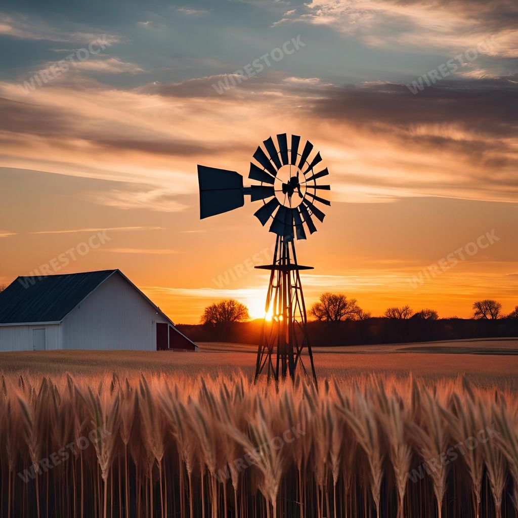 Media type: IllustrationDescription: An AI generated illustration of an idyllic countryside scene featuring a traditional windmill surrounded by lush golden wheat fields