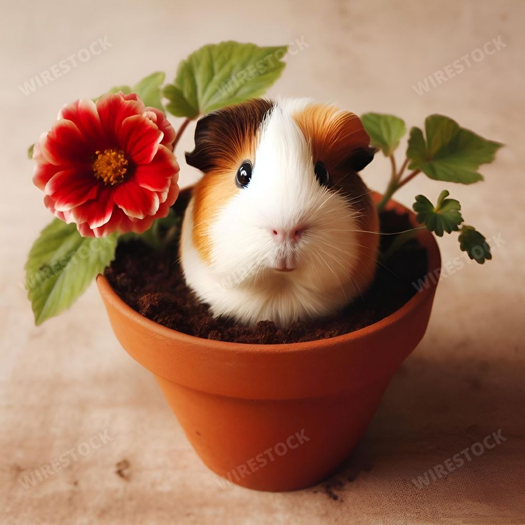 Media type: IllustrationDescription: An AI generated illustration of An adorable guinea pig is standing in a white flower pot filled with colorful blooms