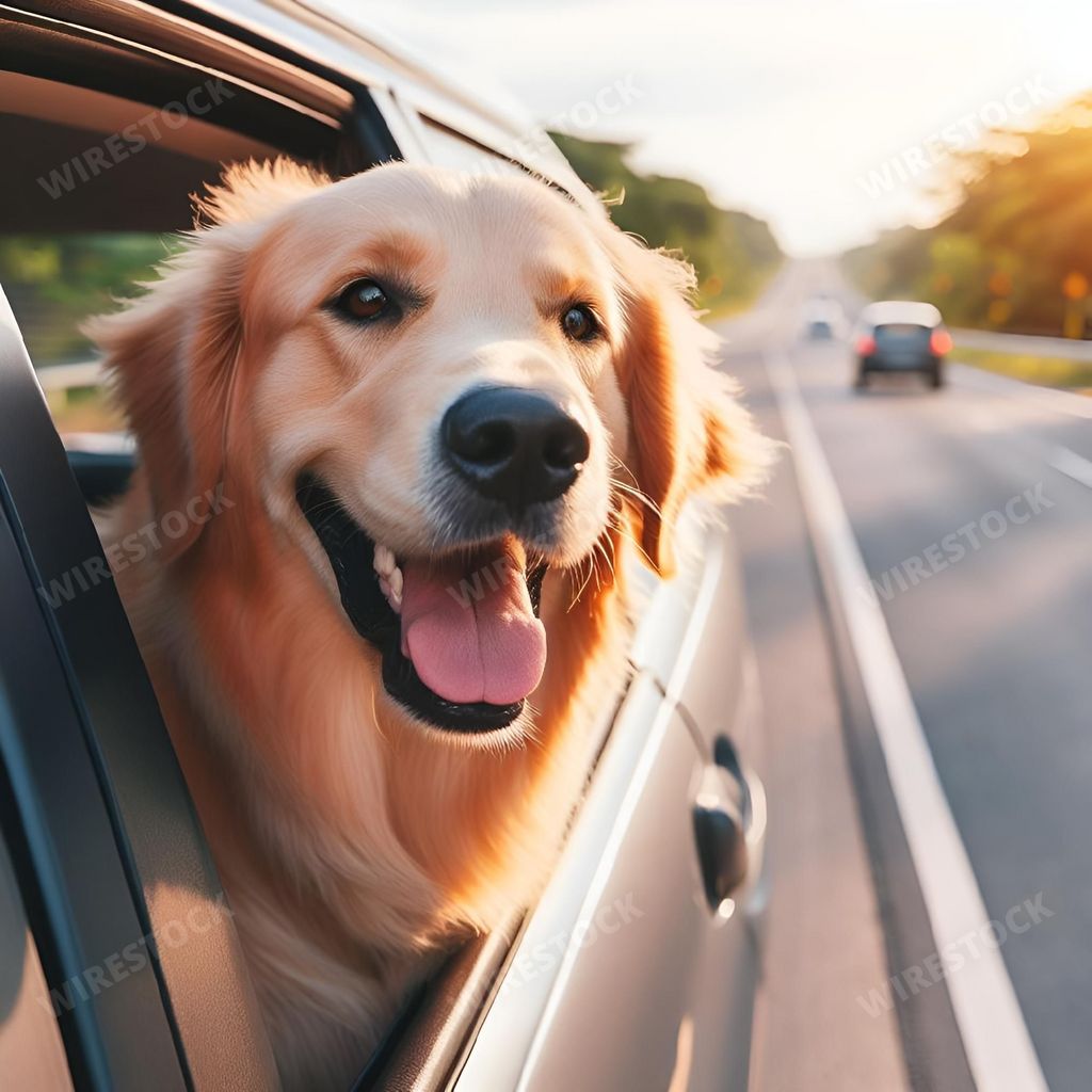 Media type: IllustrationDescription: An AI-generated illustration of a golden retriever enjoying a road trip