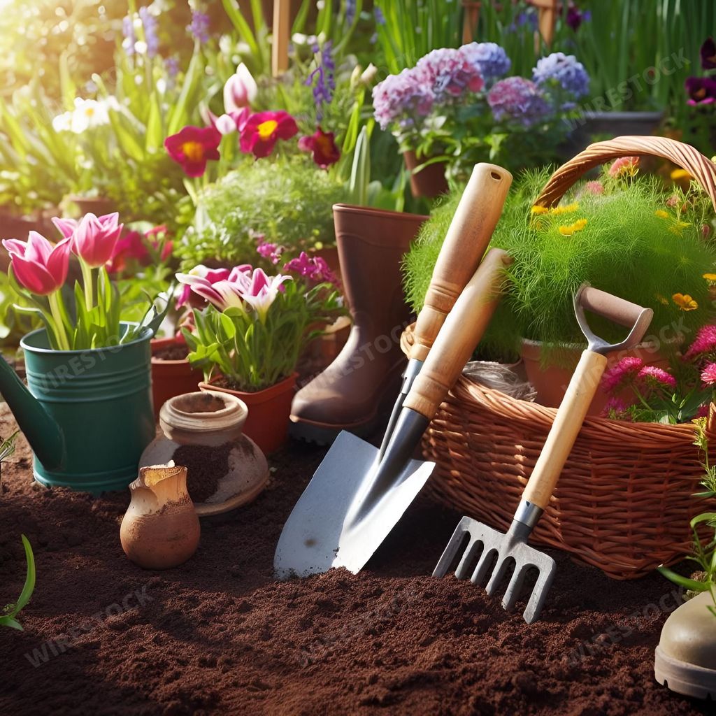 Amy in RL | gardening equipment in the ground with garden flowers around them and pots