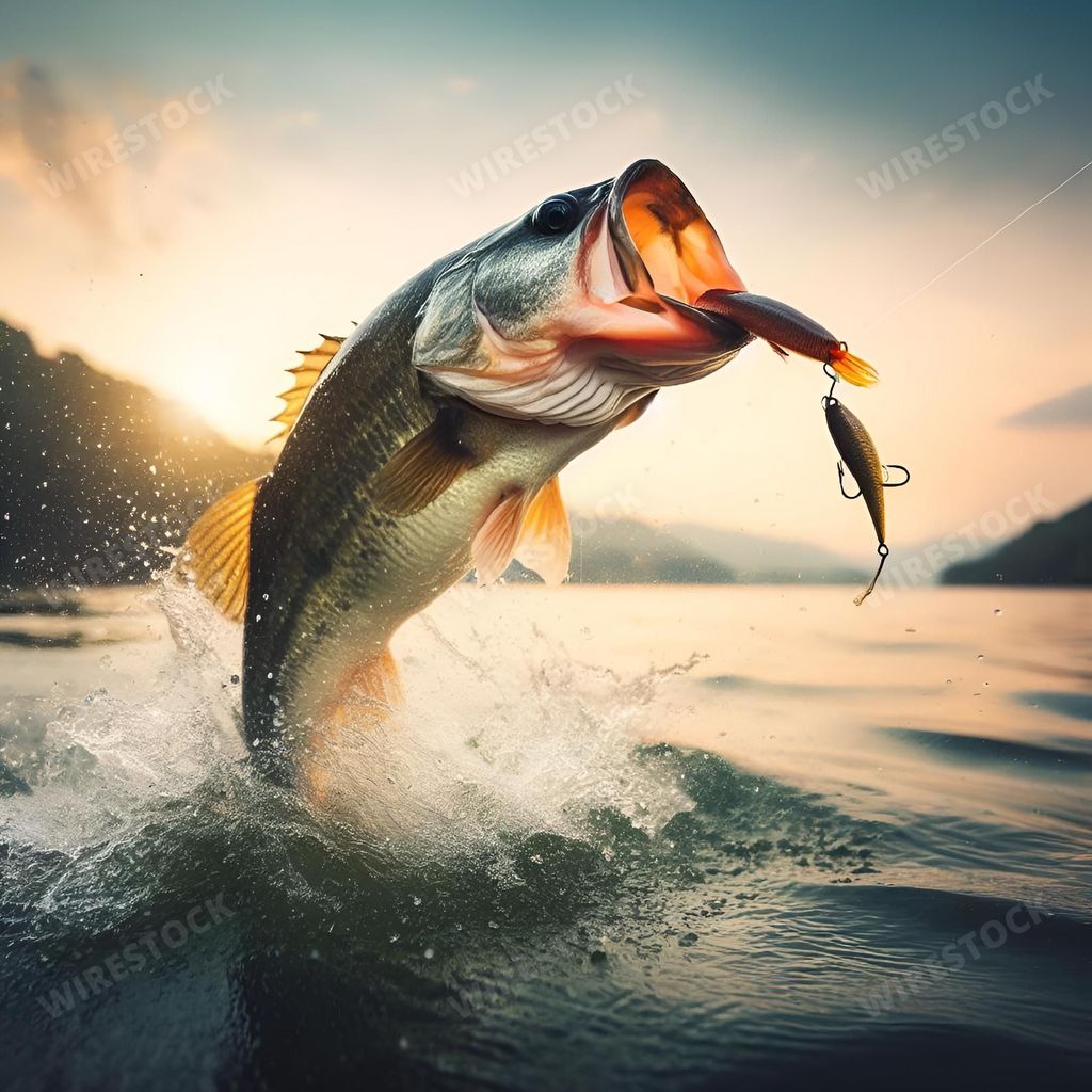 Media type: IllustrationDescription: An AI generated illustration of a large-mouthed bass leaping from the water while holding a fishing lure in its mouth, creating a splash in the water