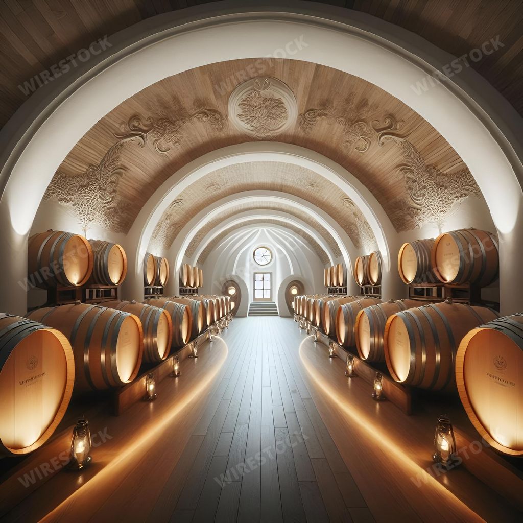 Media type: IllustrationDescription: An AI generated illustration of A cozy cellar with wooden wine barrels lined up against one wall, illuminated by flickering candles on the floor