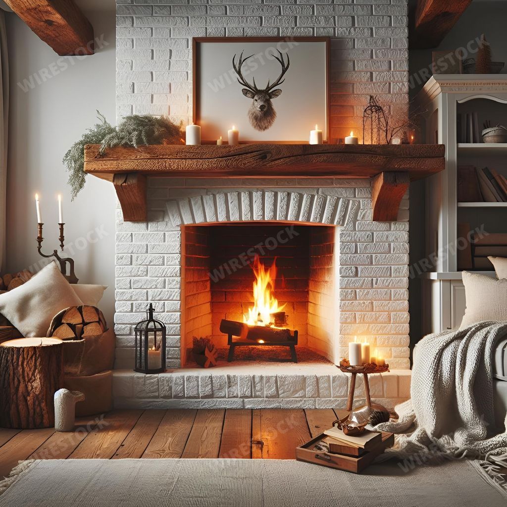 Media type: IllustrationDescription: An AI-generated illustration of A luxurious living room with a fireplace adorned with lit candles on either side