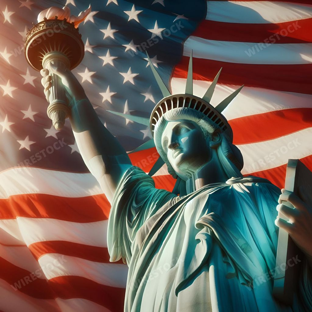 Media type: IllustrationDescription: An AI-generated illustration of A close-up view of the Statue of Liberty against the US Flag in one hand and a lit torch in the other