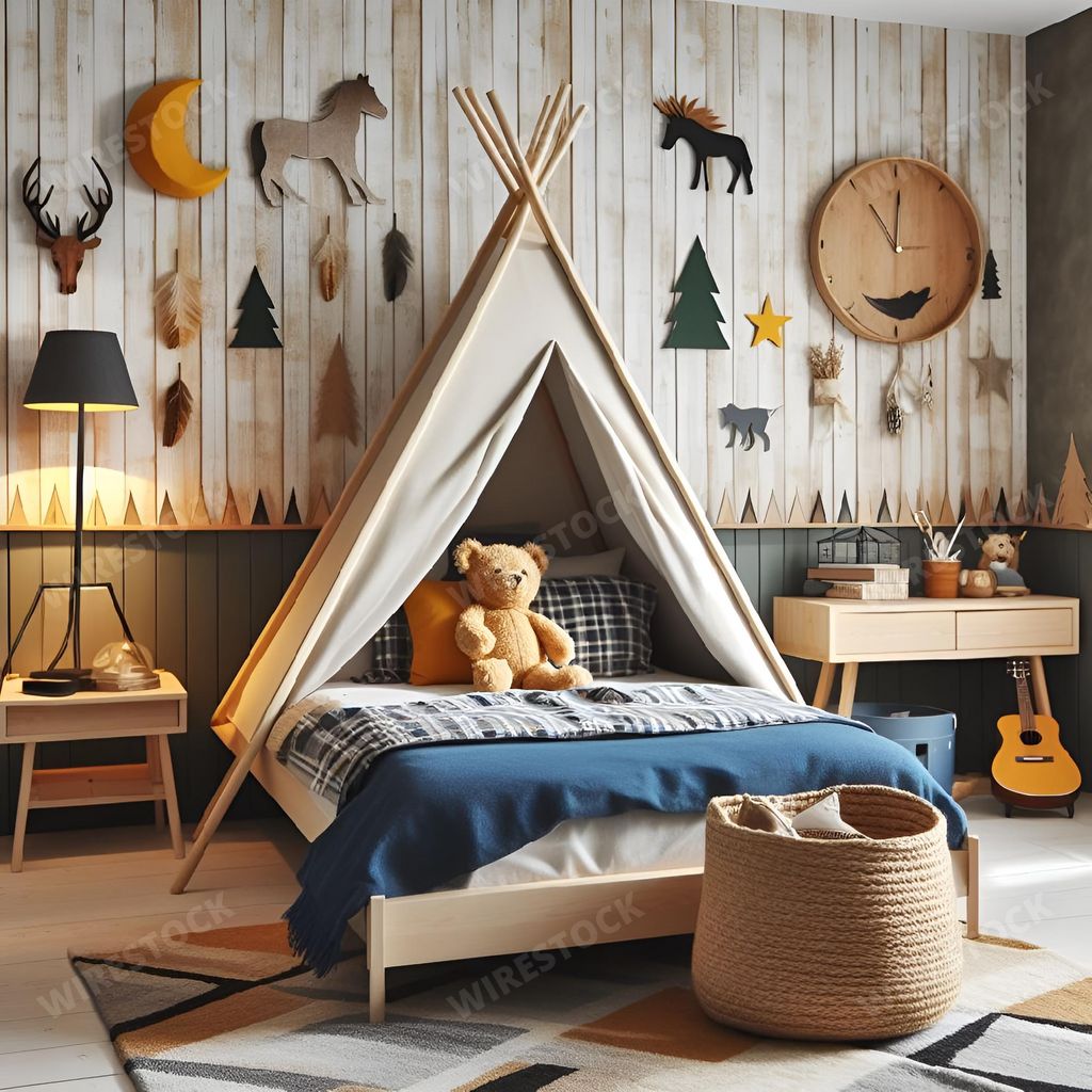 Media type: IllustrationDescription: An AI-generated illustration of a cozy children's bedroom with a playful tent set up in the corner, perfect for imaginative play
