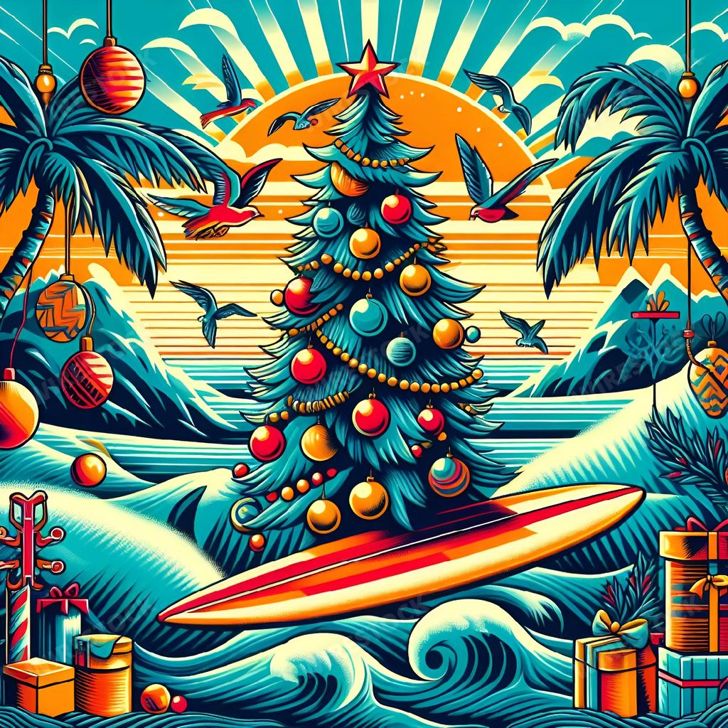 Amy in RL | a surf board sitting next to a christmas tree on top of waves