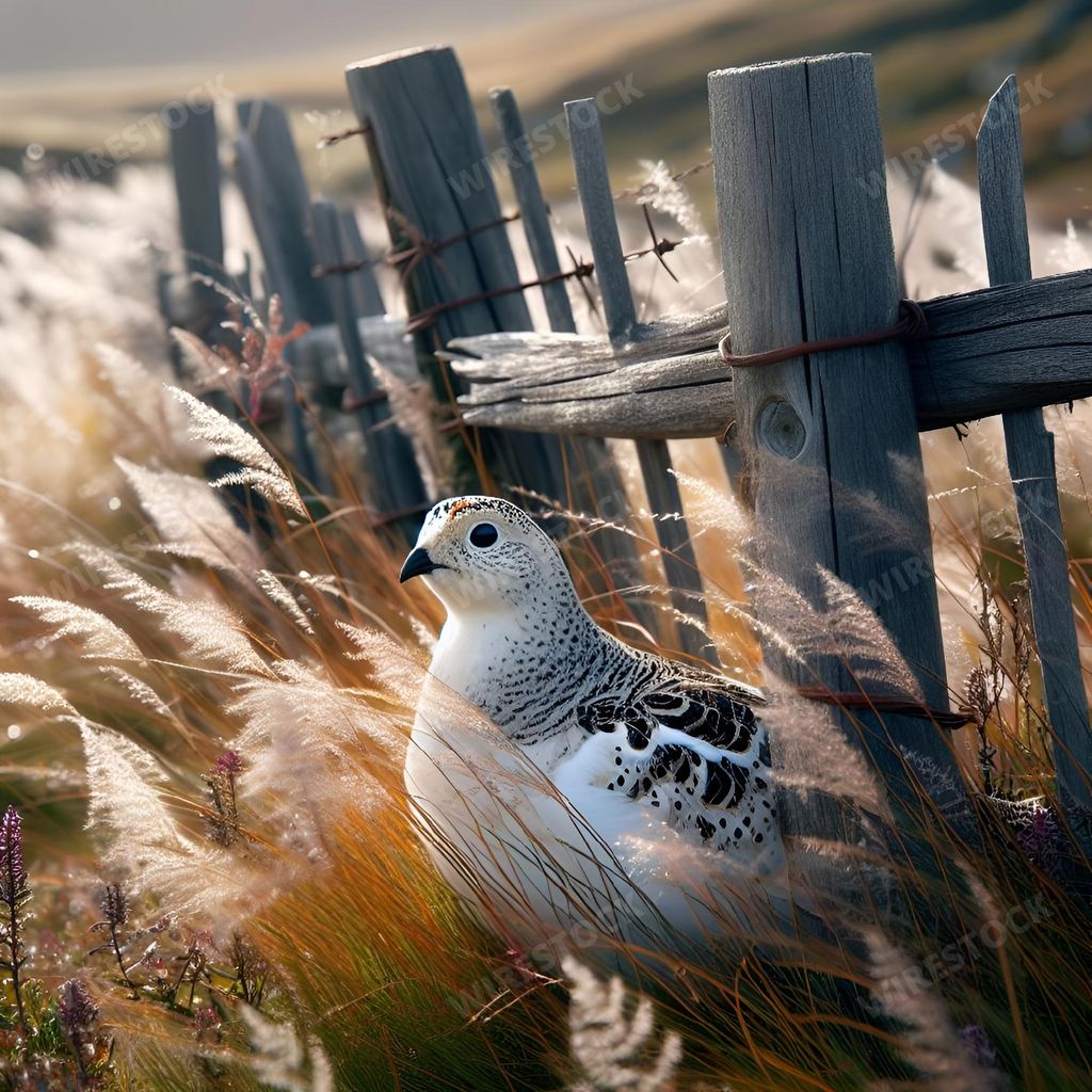 Media type: IllustrationDescription: An AI generated illustration of a snow goose in tall grass near a wooden fence