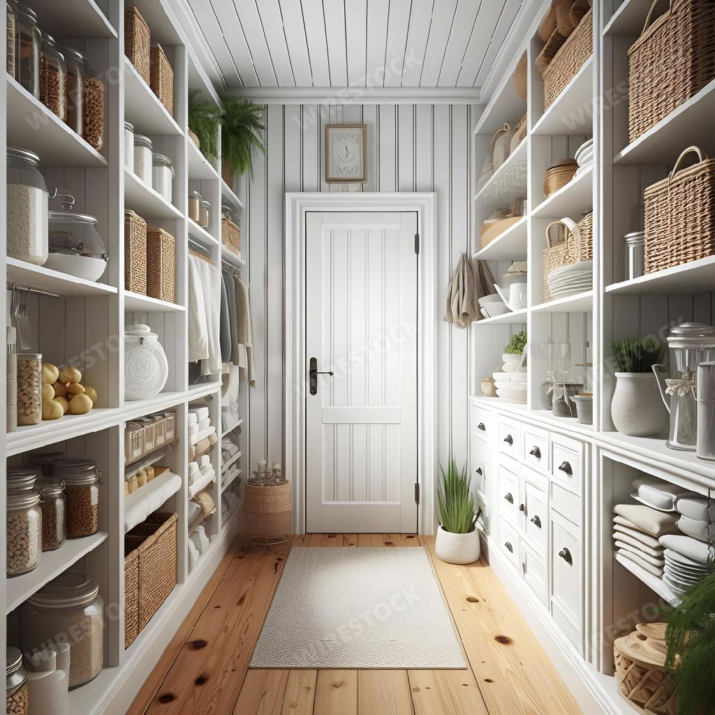 Media type: IllustrationDescription: An AI generated illustration of a well-arranged beadboard pantry