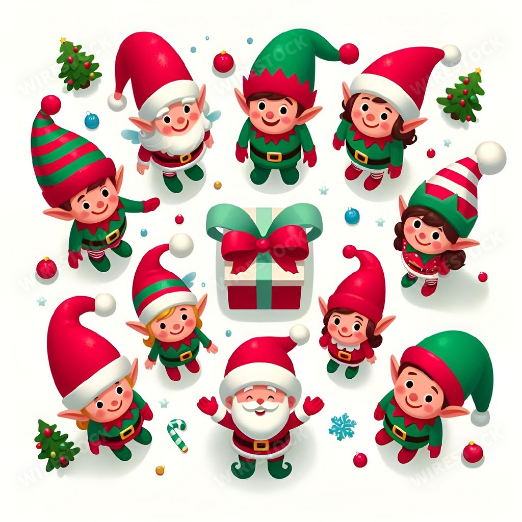 Media type: IllustrationDescription: An AI generated illustration of Santas and his elves in festive Christmas environment