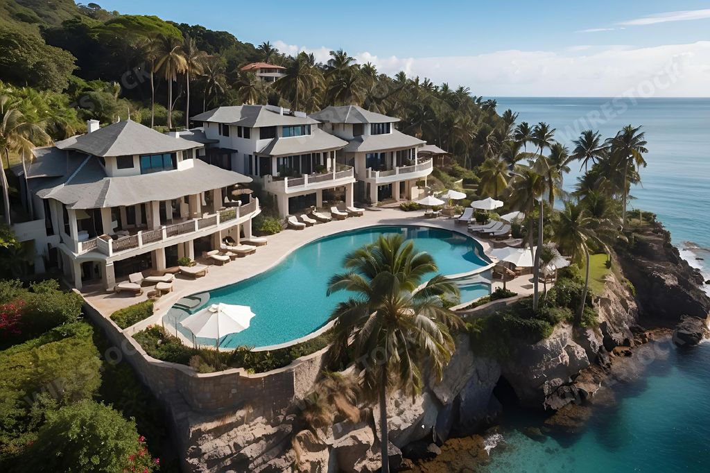 Media type: IllustrationDescription: An AI-generated illustration of resort villas surrounded by lush palm trees