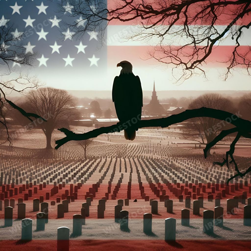 Amy in RL | a bald eagle sits in the middle of graves with a flag flying above