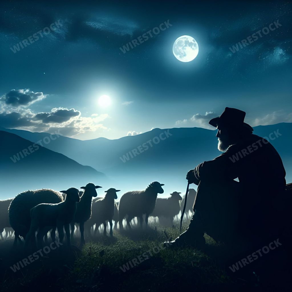 Amy in RL | a man sitting in a field watching sheep at night under the moon