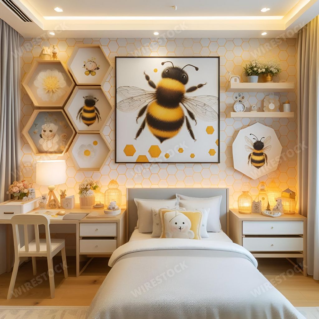 Media type: IllustrationDescription: An AI generated illustration of a bee themed bedroom