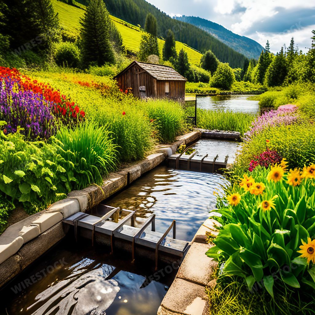 Media type: IllustrationDescription: An AI generated illustration of vibrant flowers and lush greenery surround a serene pond