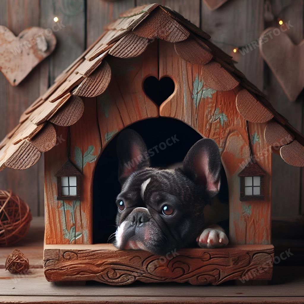 Media type: IllustrationDescription: An AI generated illustration of A small black dog resting inside a wooden house-like structure
