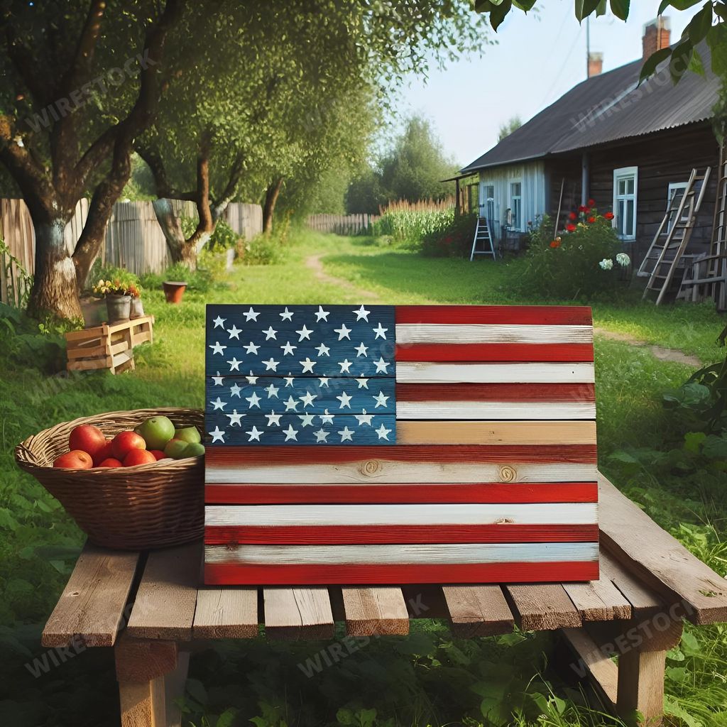 Amy in RL | an american flag painted on top of a wooden bench in the grass