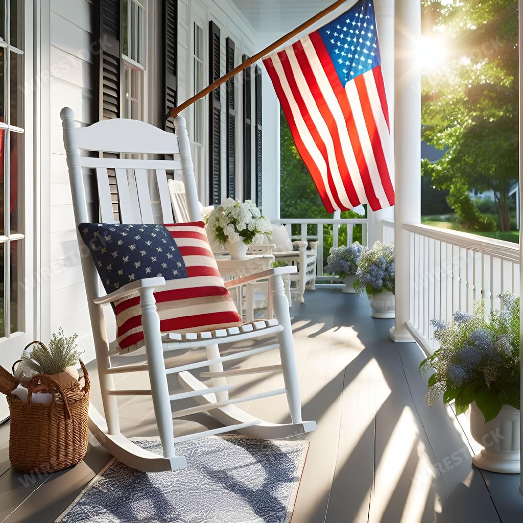 Media type: IllustrationDescription: An AI generated illustration of a large white rocking chair adorned with American flag on front porch