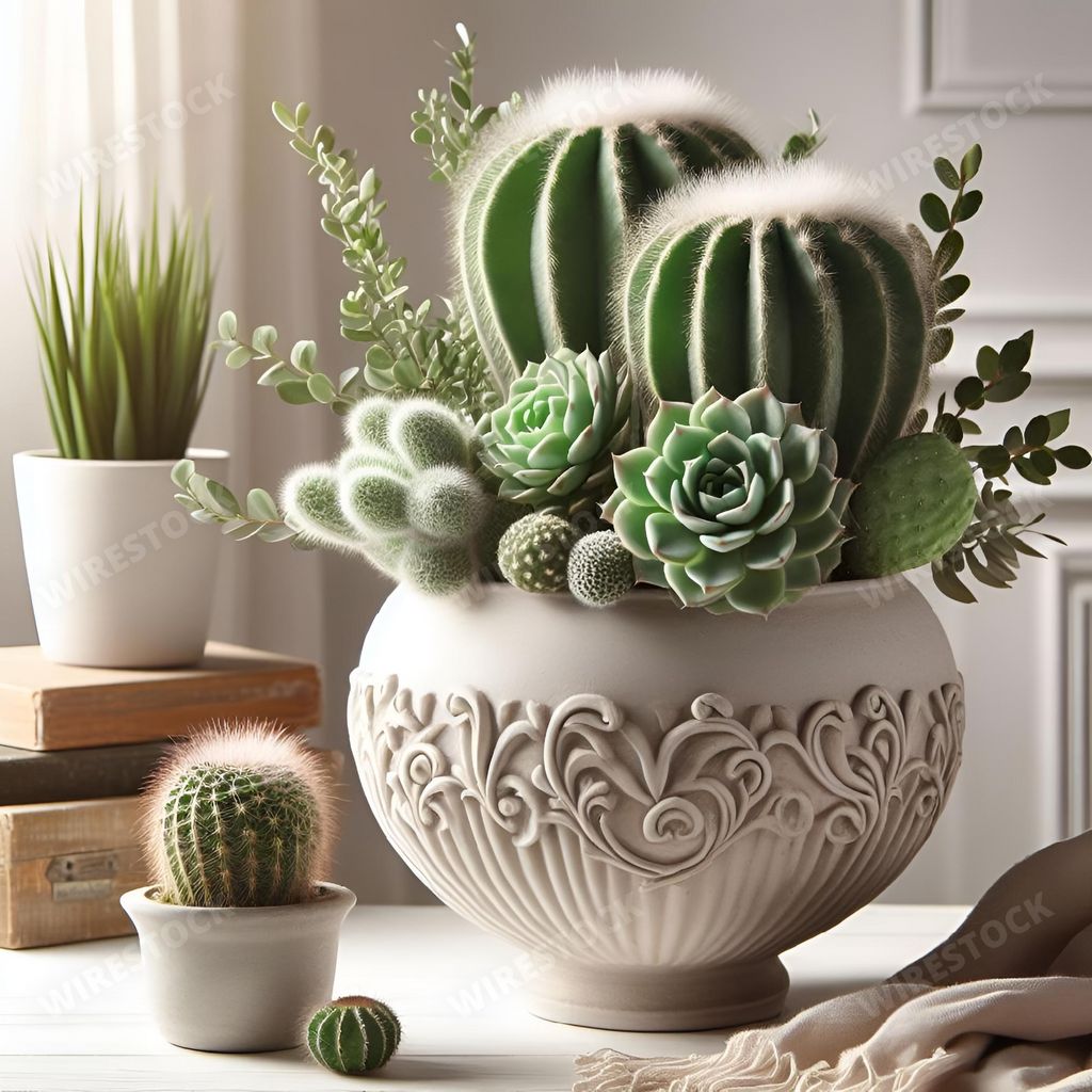 Media type: IllustrationDescription: An AI generated illustration of a cactus vase with lush green plants on a white surface