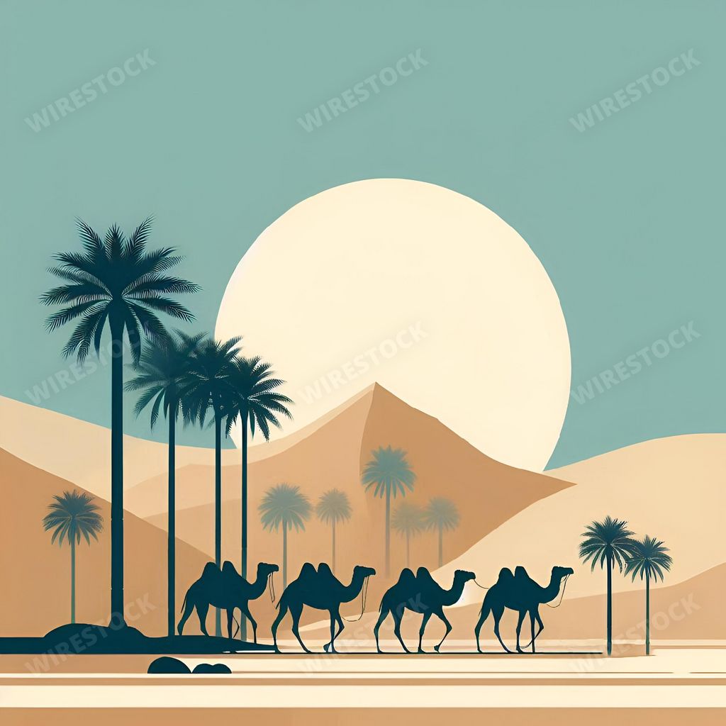 Media type: IllustrationDescription: An AI-generated illustration of camels through a desert landscape with palm trees and Sun in the back