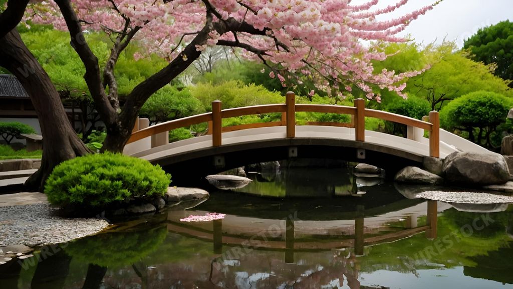 Amy in RL | A serene Japanese garden with a wooden bridge over a pond and cherry blossoms in full bloom