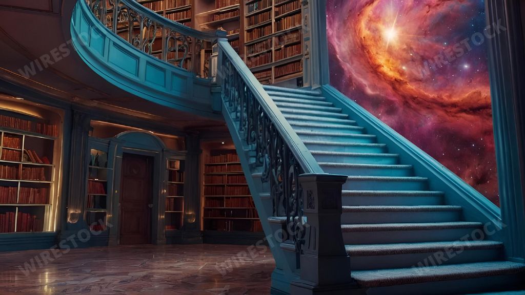 Media type: IllustrationDescription: An AI generated illustration of A grand library with a spiral staircase and a cosmic-themed mural on the wall